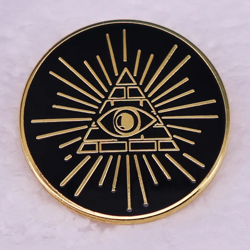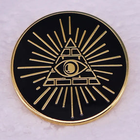 Presenting this Eye of Providence Brooch - a striking triangle design with the All-Seeing Eye against a black background and a captivating gold emblem. Symbolizing protection and insight, this brooch embodies the mystique of the Eye of Providence in a bold and distinguished style.